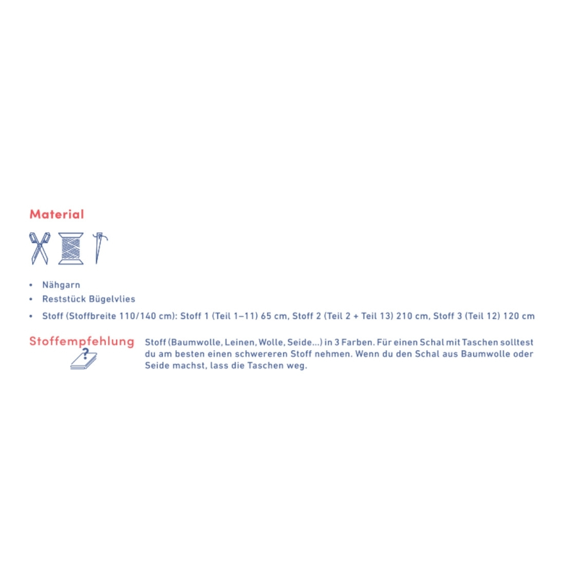 Conseil de tissu. Tissu (coton, lin, laine, soie…) en 3 couleurs. Pour une écharpe à poches, il est préférable de choisir un tissu plus épais. Si vous confectionnez l'écharpe en coton ou en soie, omettez les poches.