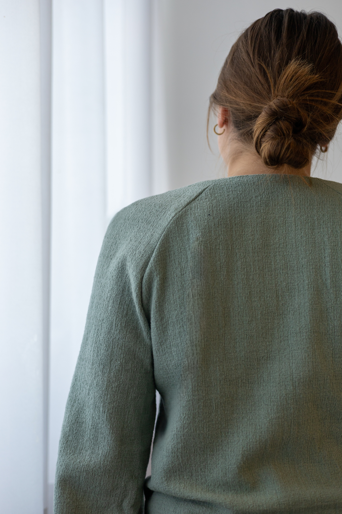 Reya est un haut festif et polyvalent avec un profond décolleté en V et de élégantes manches raglan. Et le plus amusant ? C’est toi qui décides du look ! Chic et épuré avec l’empiècement poitrine, ou romantique à souhait avec autant de rubans à nouer que tu veux.