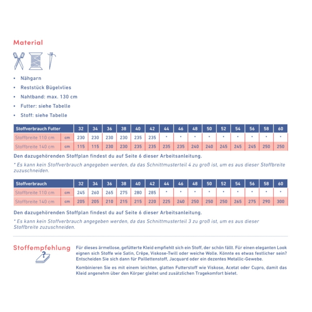 Pour cette robe sans manches et doublée, il est préférable de choisir un tissu qui tombe bien. Pour un look élégant, pensez aux tissus en satin, crêpe, sergé de viscose ou en laine douce. Pourrait-on le rendre un peu plus festif ? Optez alors pour un tissu à paillettes, du jacquard ou un tissage métallique subtil. Associez-la à une doublure légère et lisse, comme de la viscose, de l'acétate ou du cupro, pour que la robe glisse confortablement sur le corps et offre un confort supplémentaire.