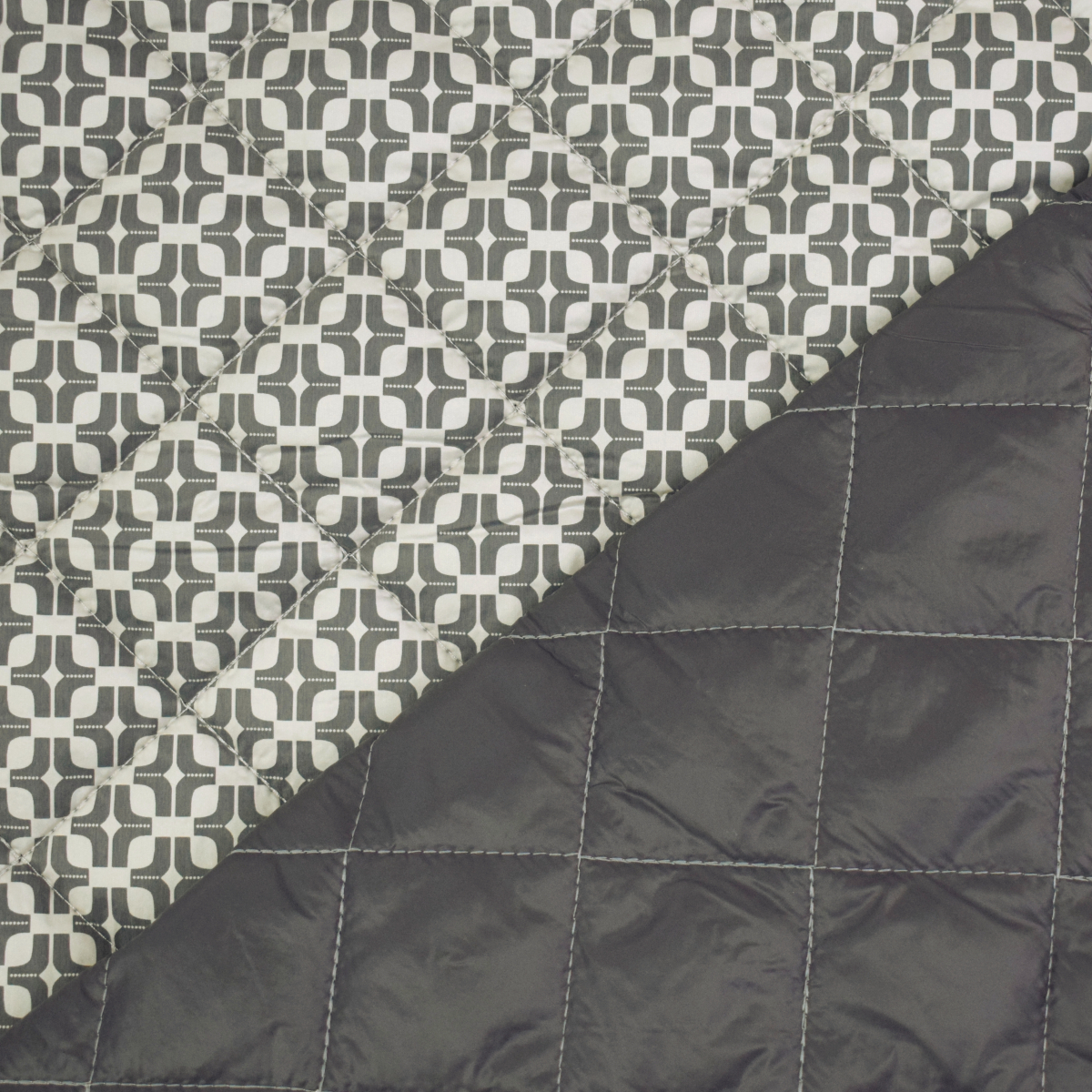Superbe tissu matelassé avec motif rétro. Le tissu est ouatiné avec un molleton doux et présente une surface légèrement brillante.