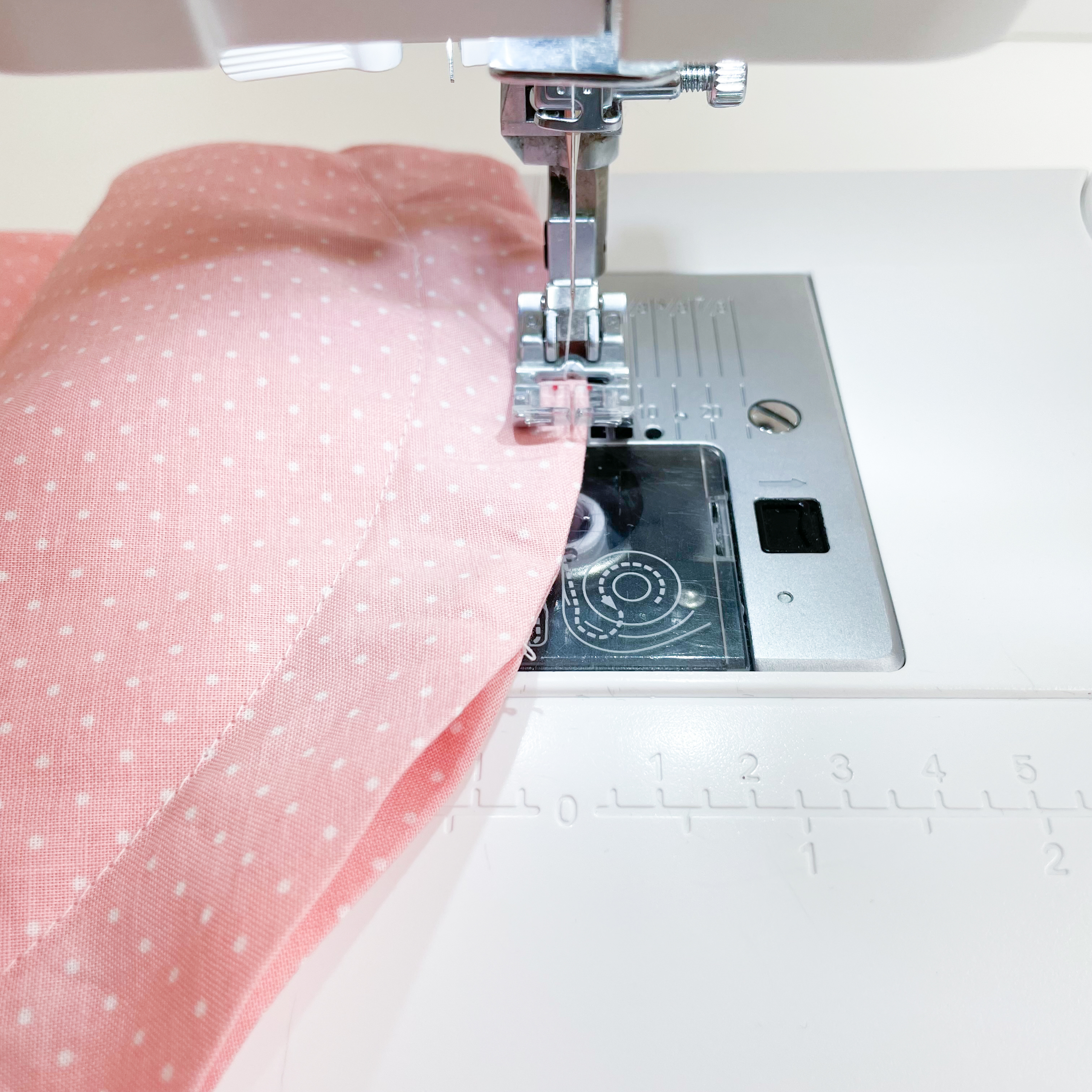 Cousez les deux couches ensemble, à la largeur d’un pied de biche, à l’exception de l’ouverture de retournement, et coupez ensuite les surplus de couture à l’aide de ciseaux cranteurs. Évitez la zone de l’ouverture de retournement.