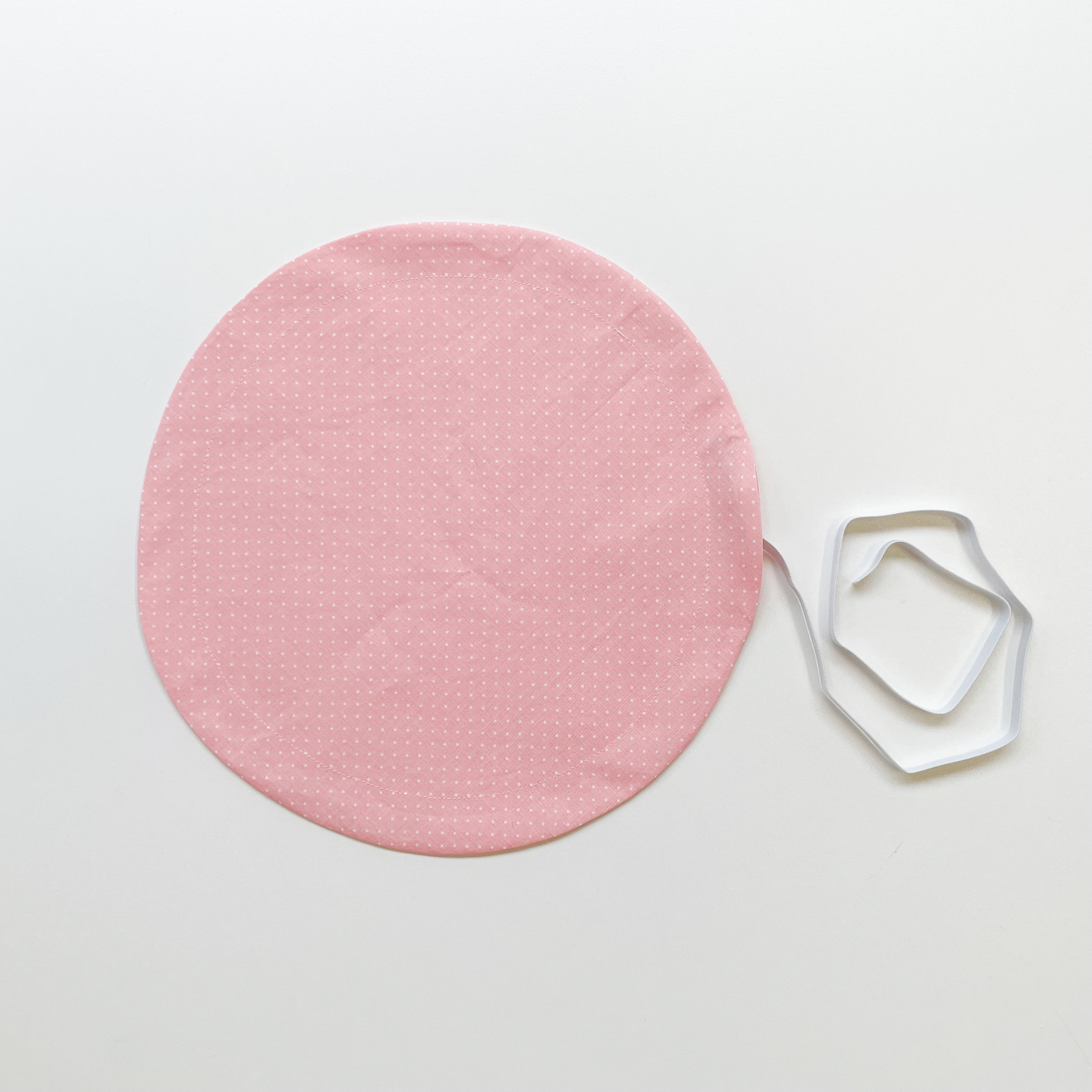 Cousez maintenant à 2,5 cm d’intervalle du bord, en dessinant un cercle. Placez un ruban élastique sur le pourtour du couvercle pour déterminer la longueur de l’élastique puis coupez-le.