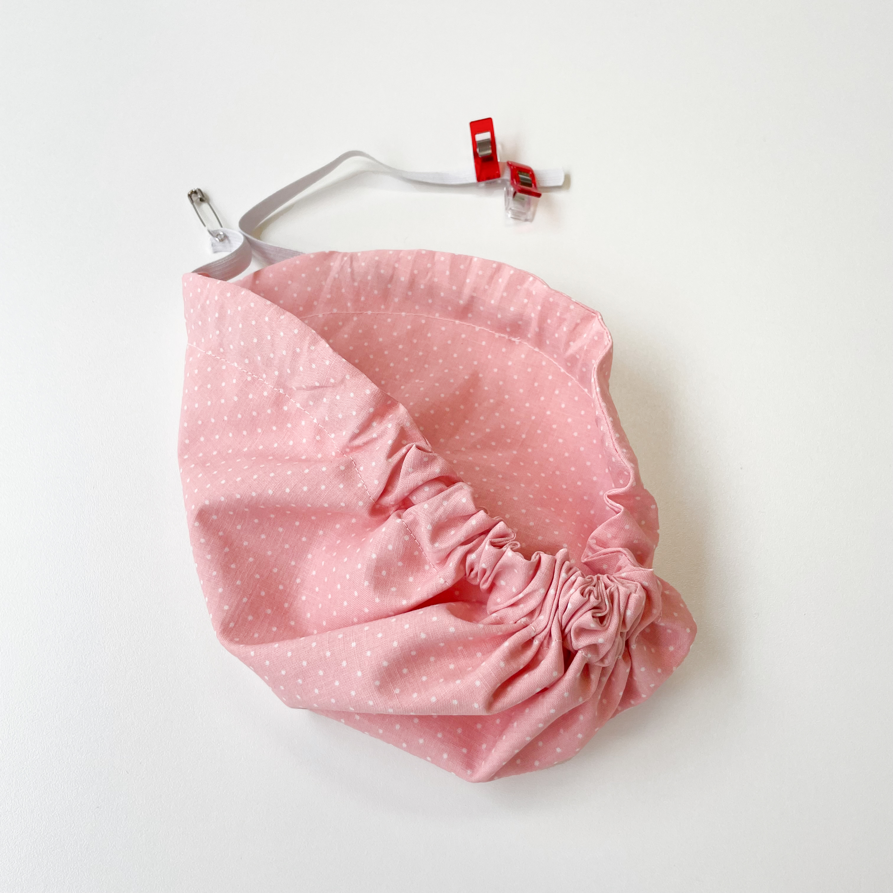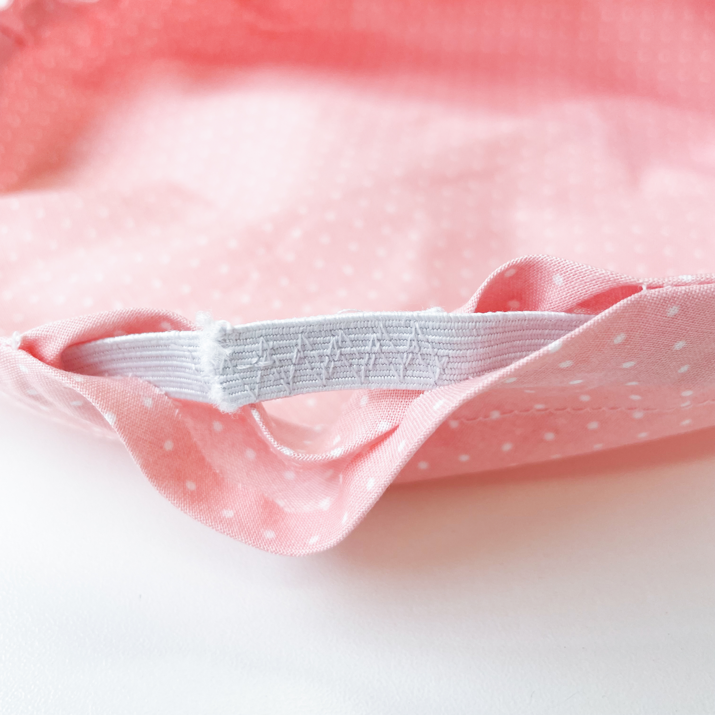 Enfilez ensuite l’élastique dans la coulisse cousue précédemment à l’aide d’une épingle à nourrice. Quelques pinces à l’autre extrémité empêchent l’élastique de glisser par mégarde.