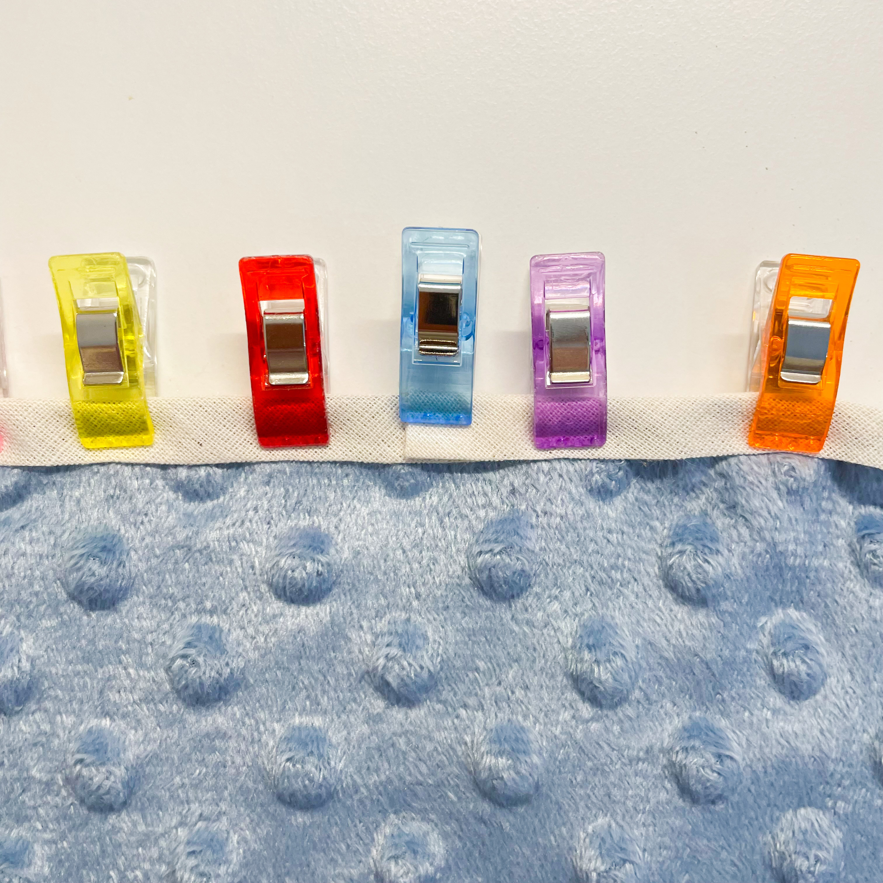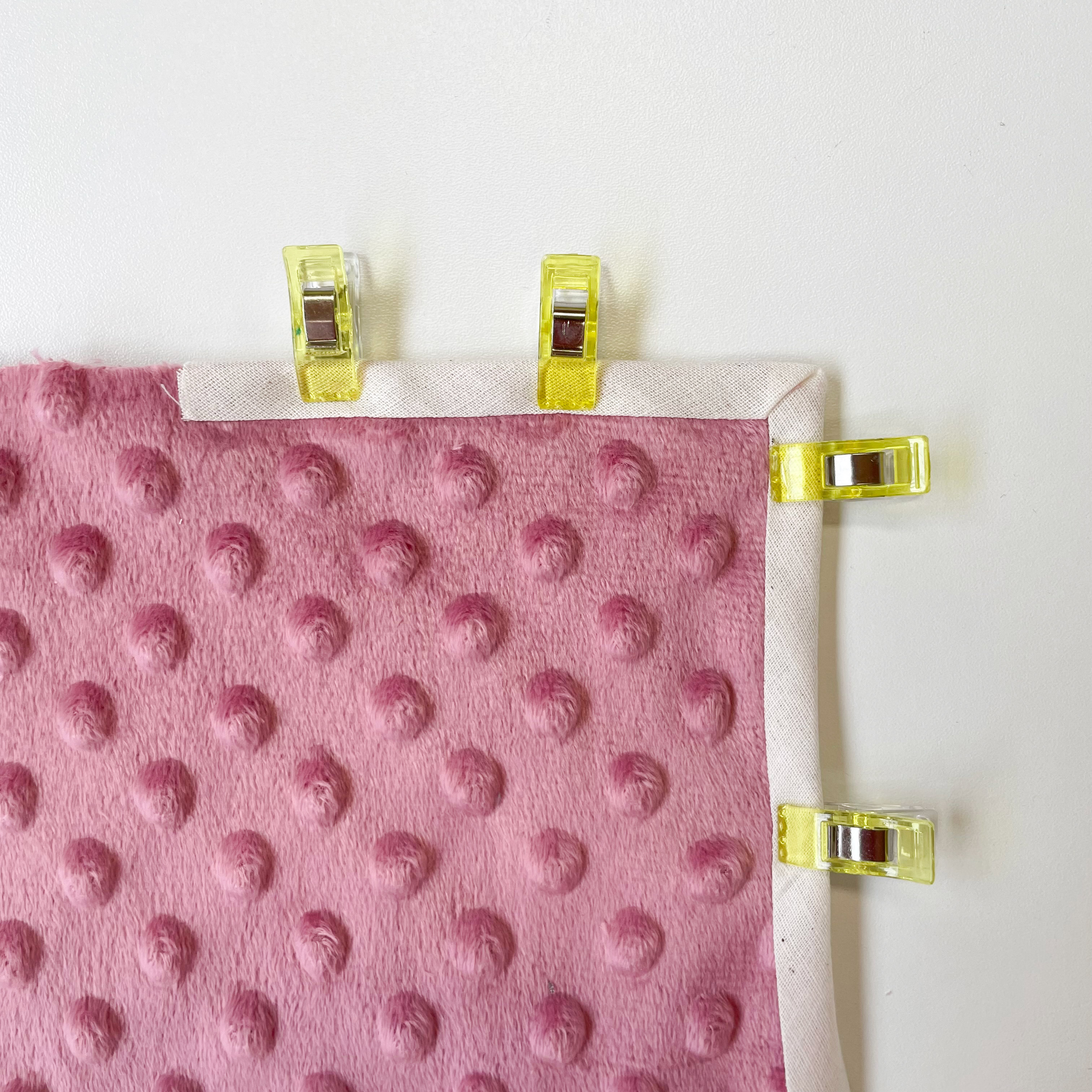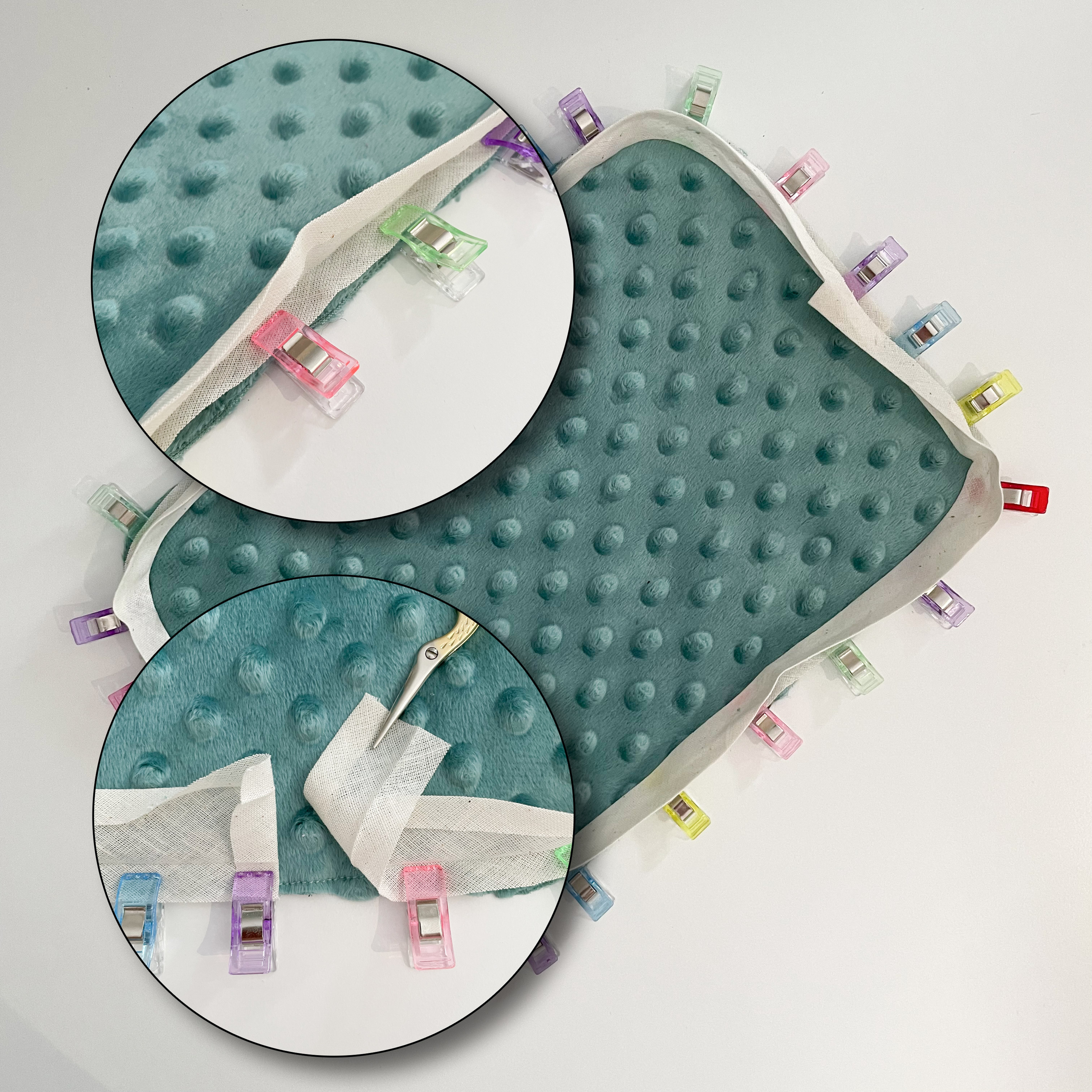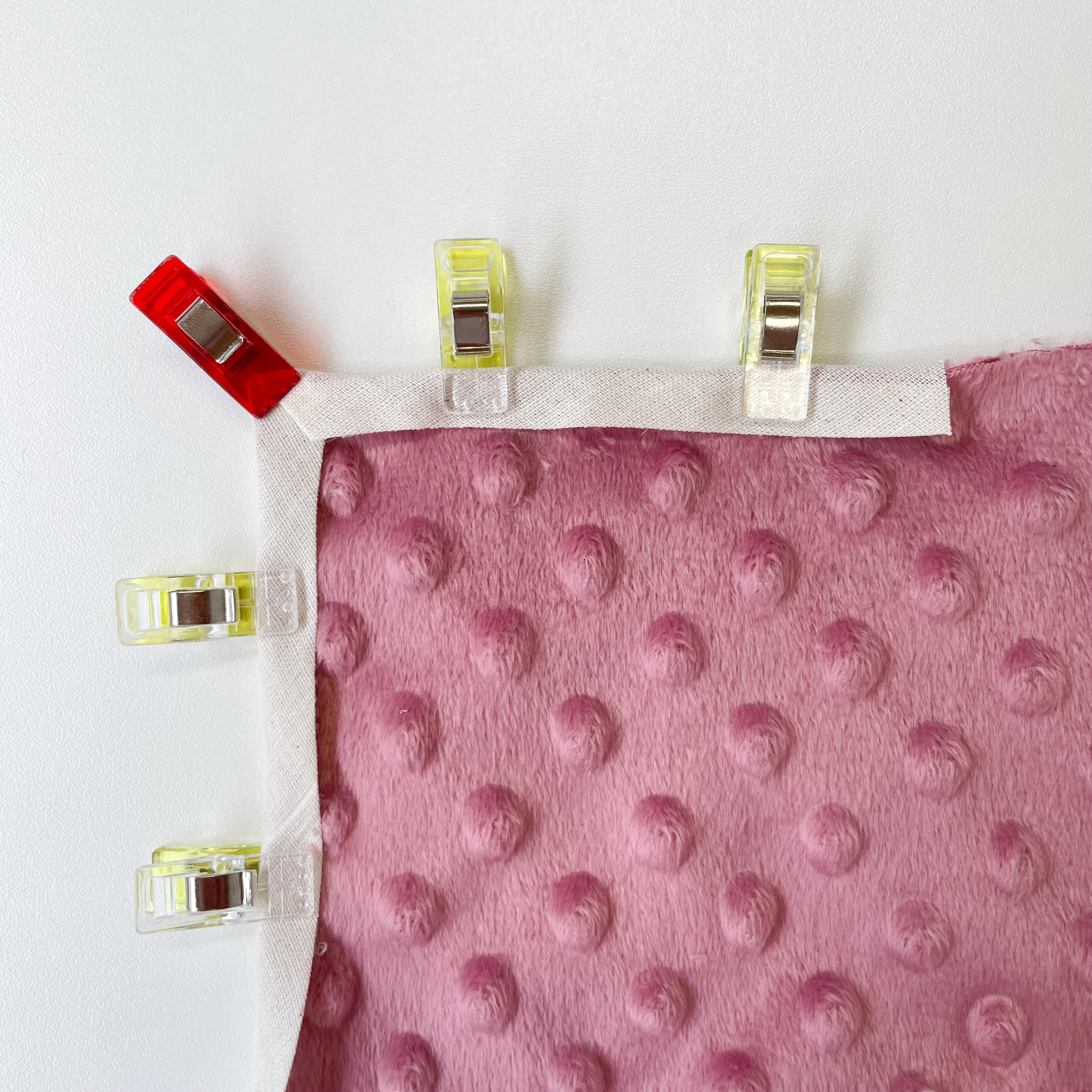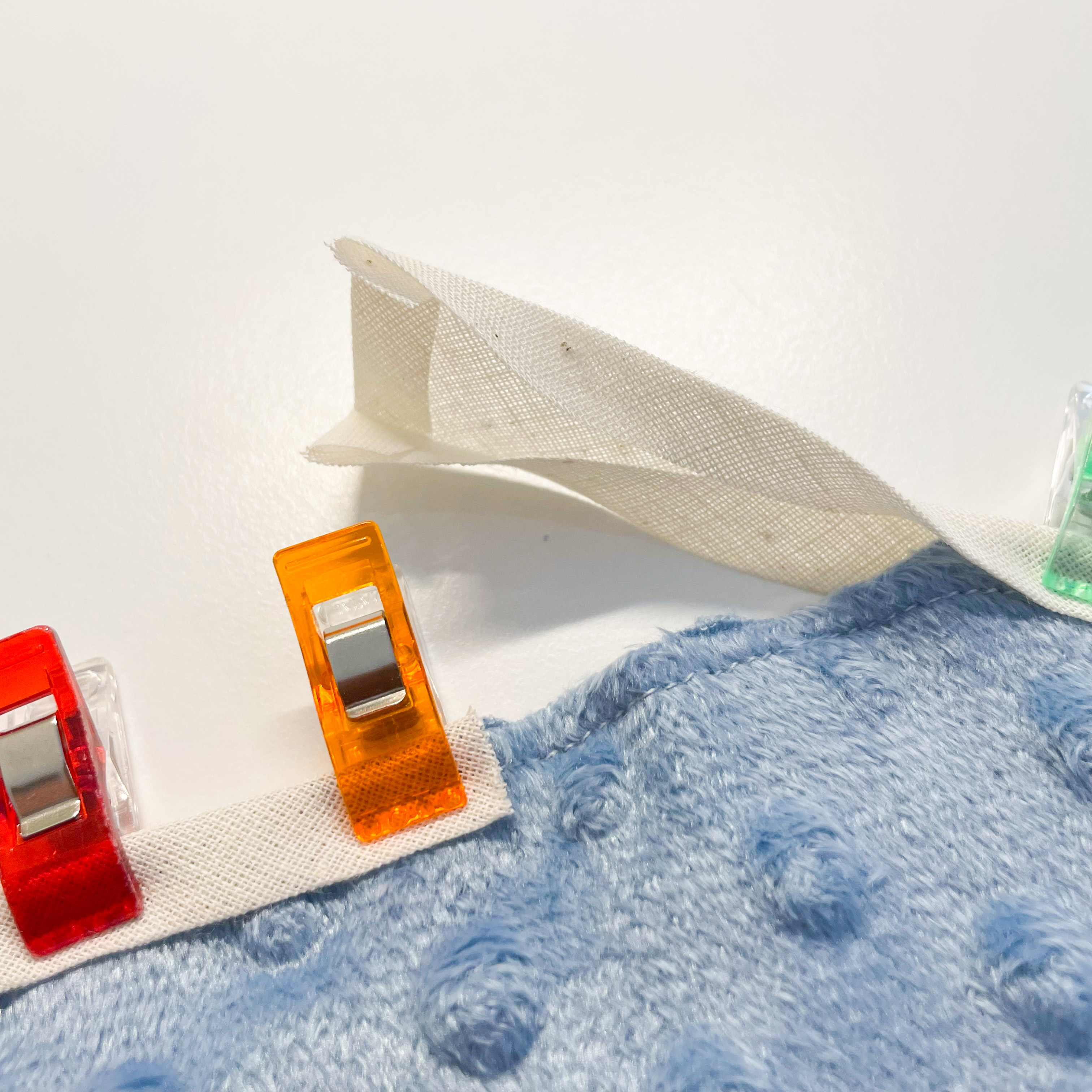 1. Placez votre biais le long de votre pièce de tissu et insérez celle-ci dans le biais plié. Fixez le biais et la pièce de tissu avec des pinces à tissu ou des épingles.