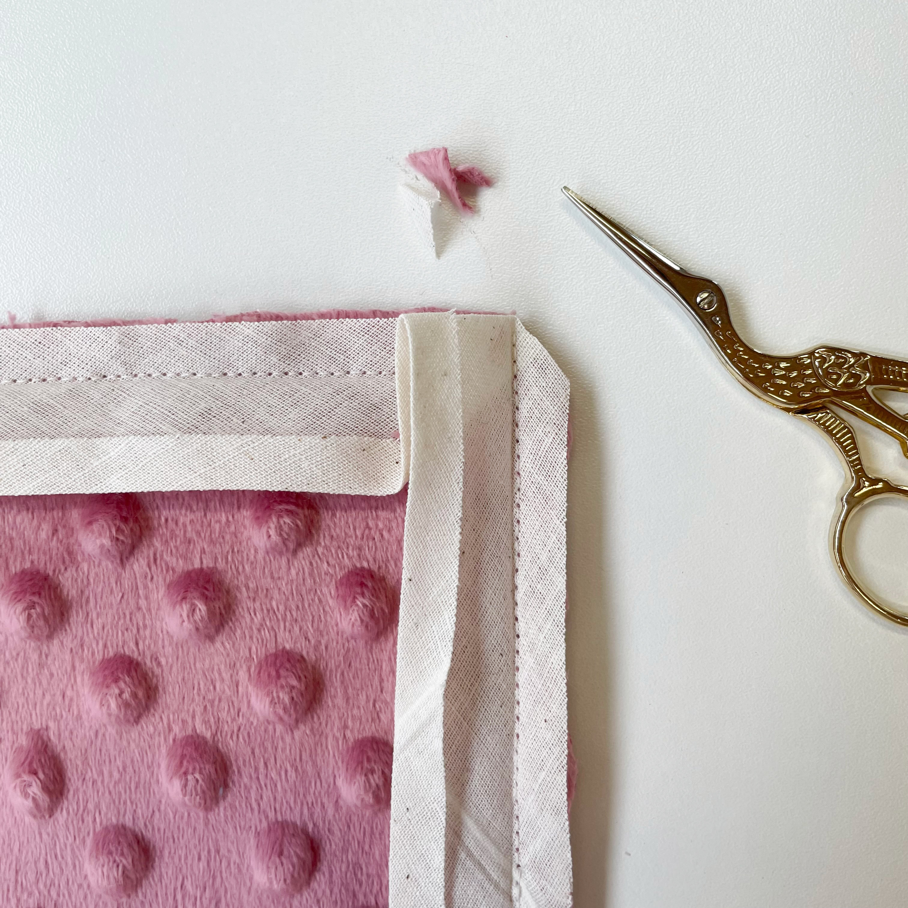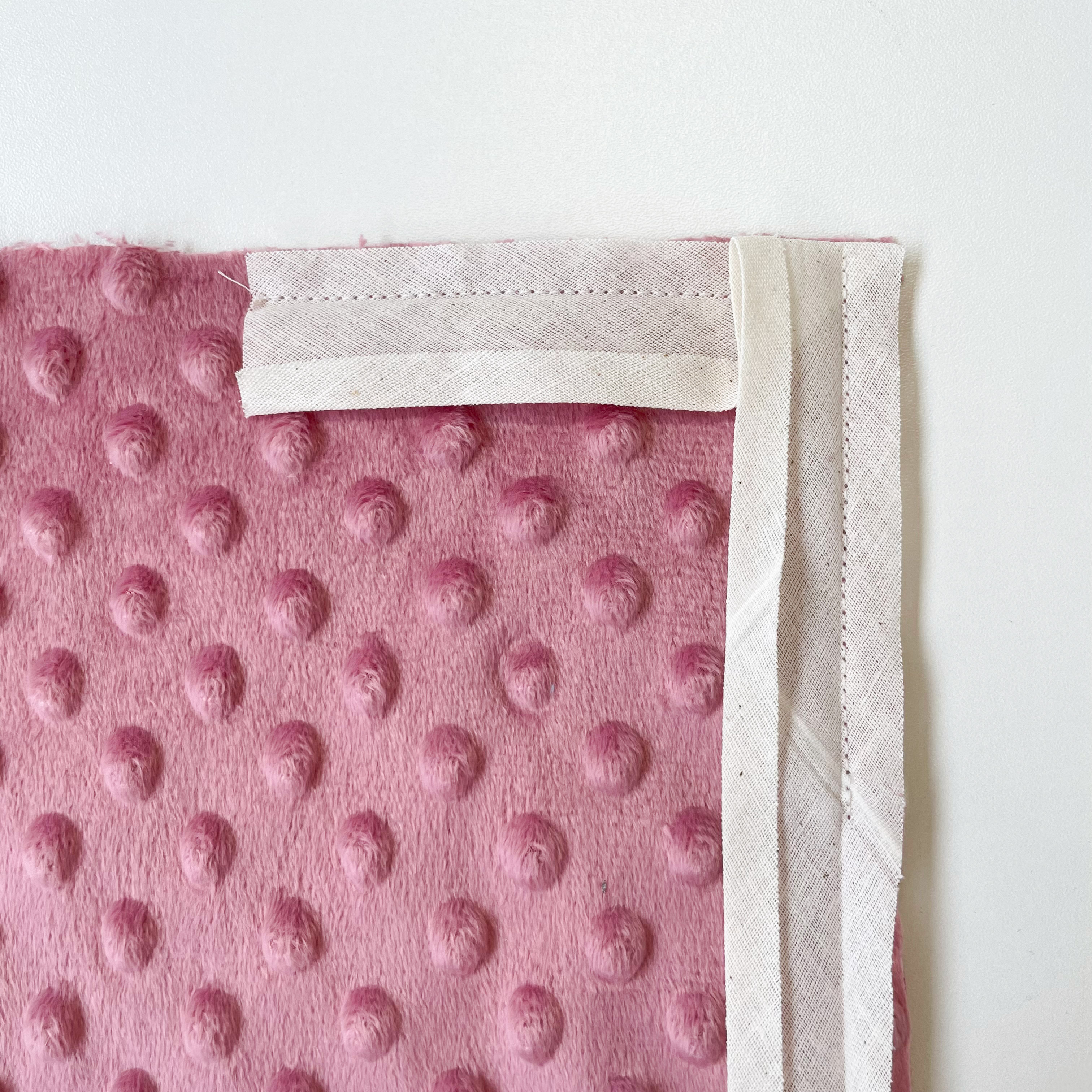 6. À présent, pliez le biais sur l’autre côté de votre lingette et formez de jolis angles sur les deux côtés de la lingette. Fixez le début et la fin du biais comme à l’étape 3 „Couture d’un biais version A“.